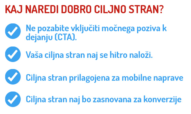 Nazadnje, vaša ciljna stran naj bo zasnovana za konverzije. Imejte jasen poziv k dejanju, ki se ujema z vašim oglasom. Ljudem olajšajte izvedbo želenega dejanja, naj bo to nakup, prijava na novice ali zahteva po dodatnih informacijah.