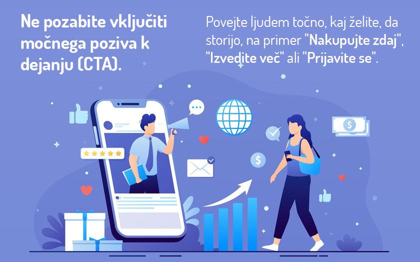 Ne pozabite vključiti močnega poziva k dejanju (CTA). Povejte ljudem točno, kaj želite, da storijo, na primer "Nakupujte zdaj", "Izvedite več" ali "Prijavite se".