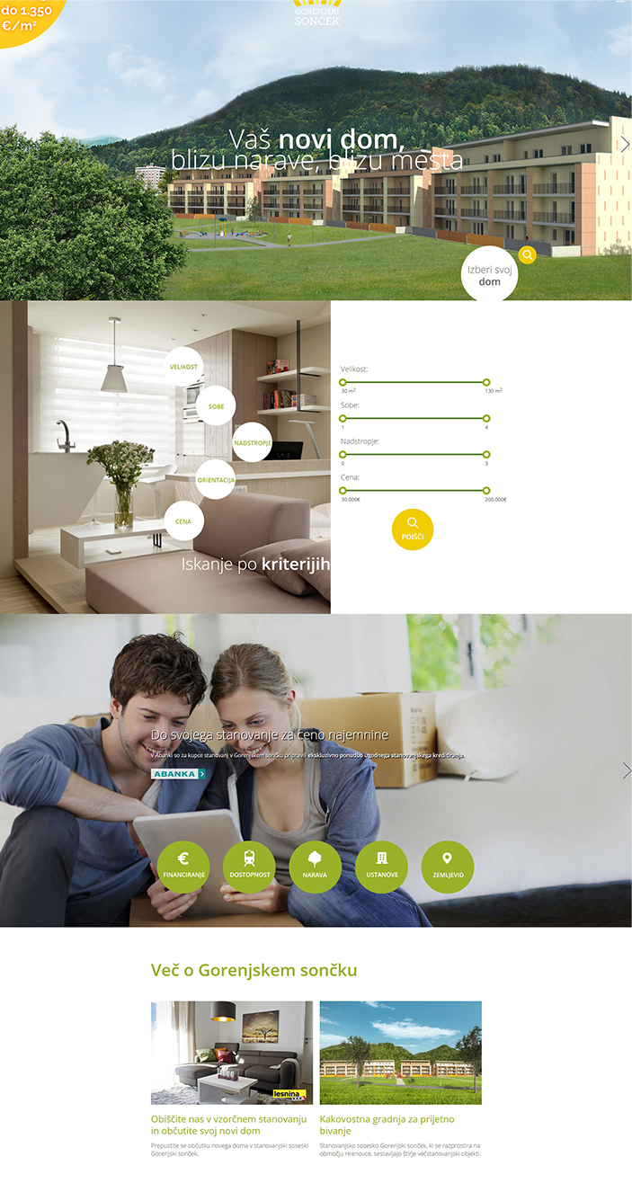 Gorenjski sonček je sodoben večstanovanjski objekt na Jesenicah, ki vam zagotavlja kakovost bivanja, saj vam z okolico nudi vse, kar potrebujete. Na južni strani objekta se razprostira urejena zelenica z otroškim igriščem, v neposredni bližini pa vas čaka živahnost mestnega jedra: šola, vrtec, občina, upravna enota, železniška postaja, nakupovalno središče in območje Stare Save, ki je z obnovo postalo kulturno središče Jesenic.