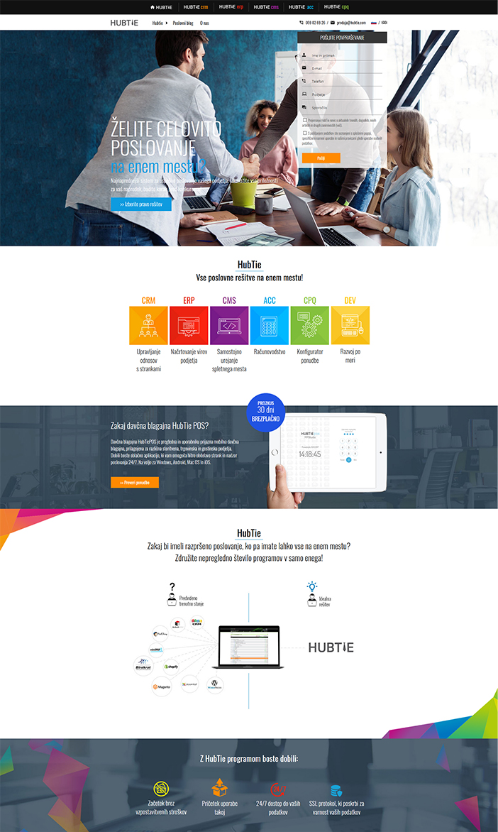 Pri HubTie združujemo vse poslovne rešitve na enem mestu. Rešitve so zasnovane modularno, med seboj pa jih je možno enostavno povezovati in tako prilagajati zahtevam posameznih naročnikov. Glavni izziv pri novi spletni strani je bil, da bi vse rešitve predstavili kot samostojne module, ki pa so vseeno povezani v neko skupno celoto. Pri MMstudiu so nas navdušili s svojim ustvarjalnim pristopom in strokovnostjo na področju spletnega nastopa, tako da smo dobili moderno, svežo in predvsem prodajno uspešno spletno stran.