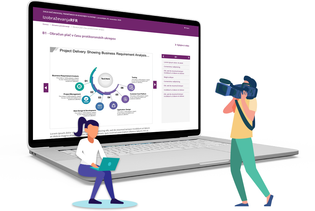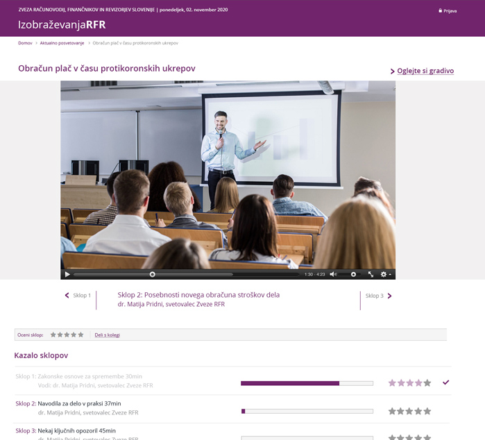Pandemija korona virusa je ogromno podjetjem po vsem svetu onemogočila izvedbo izobraževanj in usposabljanj na klasičen način. Za Zvezo RFR je bila edina smiselna odločitev, da se strankam približajo tako, da jim ponudijo brezkontaktno predavanje prek spleta. Za potrebe izvedbe tovrstnega izobraževanja smo organizirali snemanje in video produkcijo, dostop do posnetkov pa omogočili preko spletne video platforme. Celoten projekt in razvoj platforme je bil načrtovan in izveden v našem podjetju. Glavni izzivi s katerimi smo se srečevali pa so poleg usklajevanja z Zvezo bili predvsem zagotoviti brezhibno in enostavno delovanje platforme, unikatna prilagoditev video predvajalnika, avtomatsko obveščanje uporabnikov, omejen časovni dostop do vsebin, plačilni sistem, itd. Vse skupaj nam je odlično uspelo in to zgolj v času enega meseca.